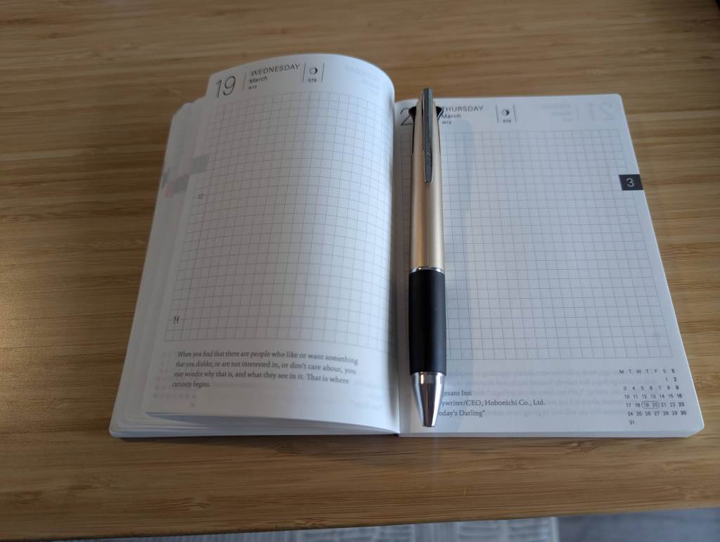 I’ve already explained how great the physical construction of the pages are – they hold ink remarkably well. What’s also wonderful about them is the design. Every two pages is two days alongside a quote from some Japanese luminary or from Itoi’s own storied blog.