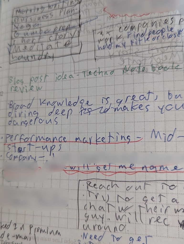 That limitation forces me to be judicious about what I write down. If I find myself working with bigger ideas, I know I actually need to grab my composition notebook from home, so I’ll write enough to stick the moment in my head. No fat here, only bone.