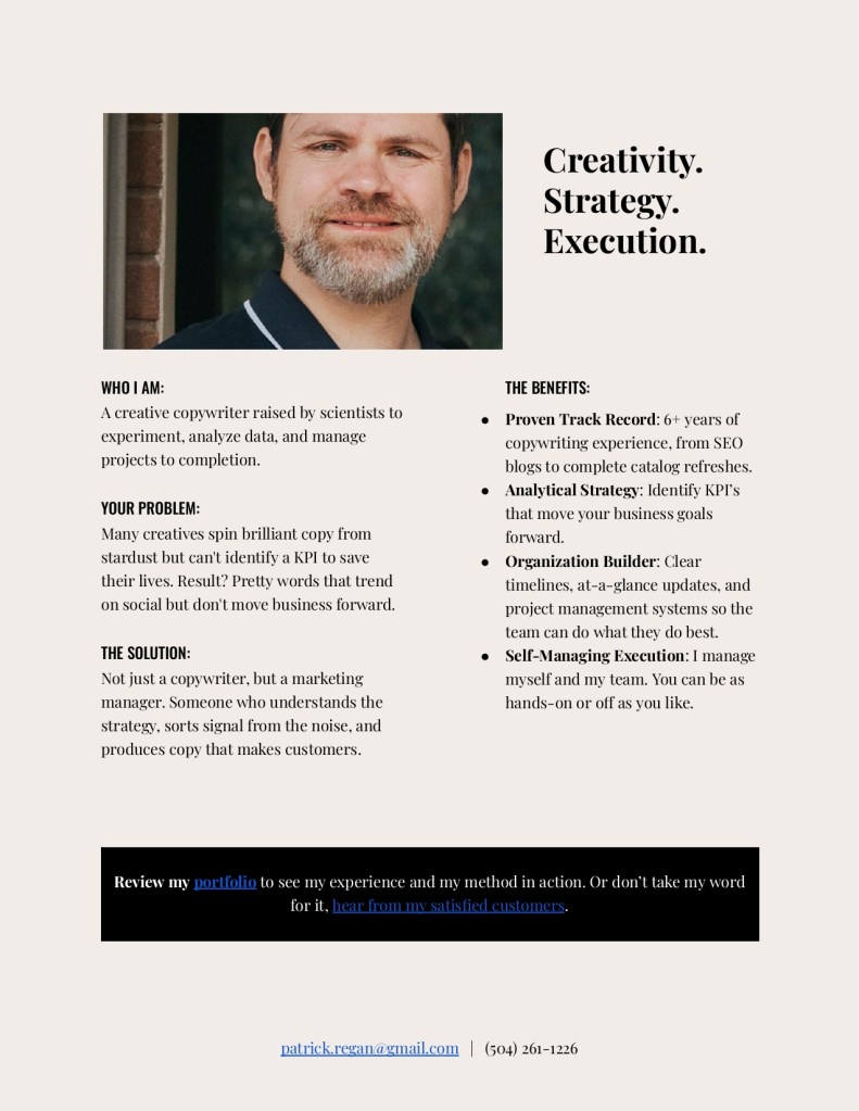 That’s who I am. Not just a copywriter, but a marketing manager. A creative who builds a strategy, executes tactics, and tracks the data to learn the results. All with the end goal of growing your business, not my own ego.